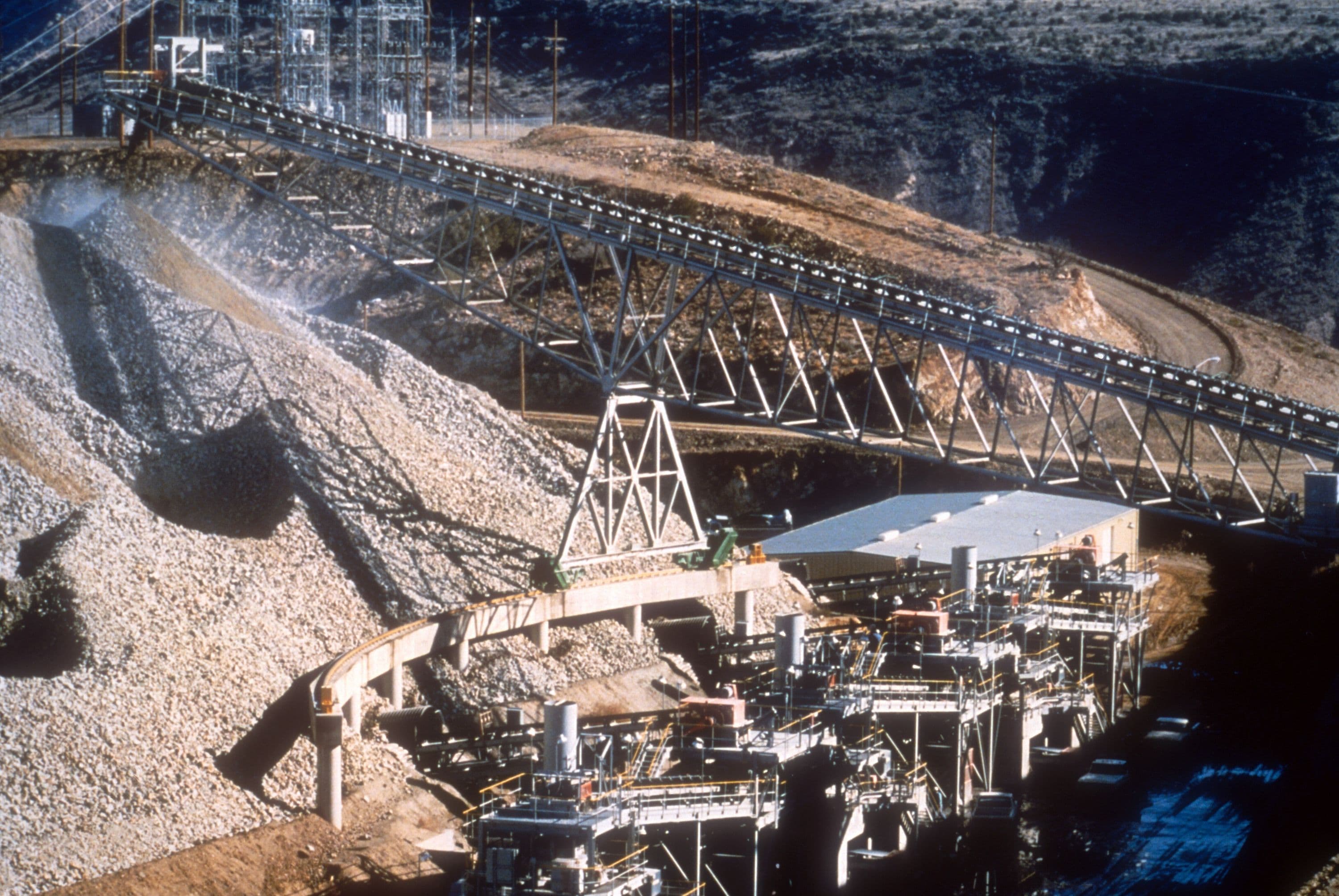 Ore from the pit is trucked to the primary crusher, and then carried on a 6,500-foot long overland conveying system to the radial stacker. The ore is belt-fed to the autogenous ball/cone crusher circuits and then moves to a potation circuit.