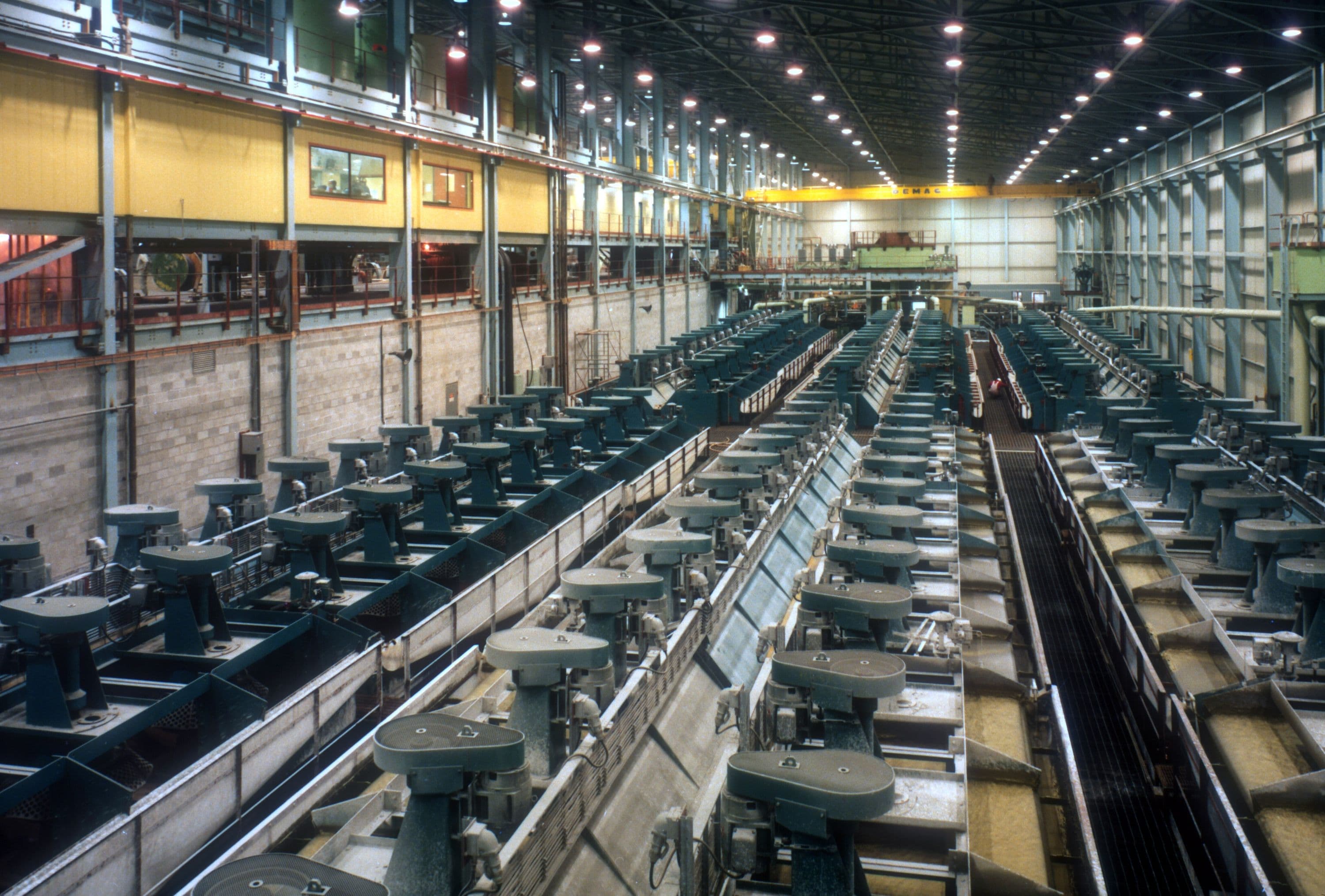 Island Copper's six autogenous grinding mills, each 32 feet in diameter and 14 feet in length, formed the largest totally autogenous grinding circuit in the copper industry at the time. The grinding mills convert the ore into approximately 230,000 tons annually of copper concentrate and 1,800 tons of molybdenum concentrate.